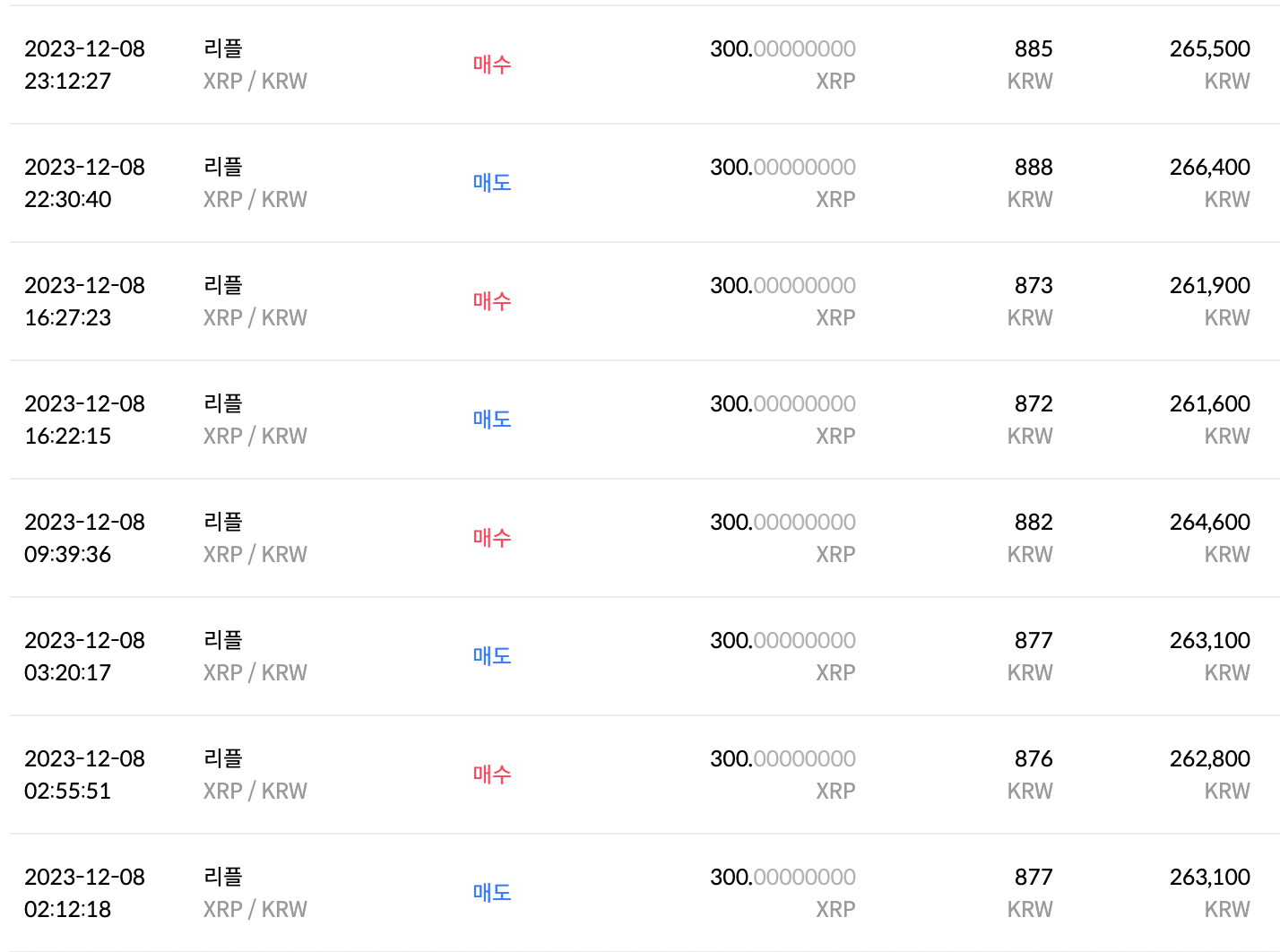 - 두 거래소의 거래 내역을 보면 성공적으로 원하는 타이밍에 각 거래소에서 "매수, 매도"가 발생하는 것을 확인 할 수 있음